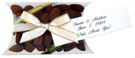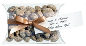 nuts tied with satin ribbon and personalized favor tag. The ribbon is